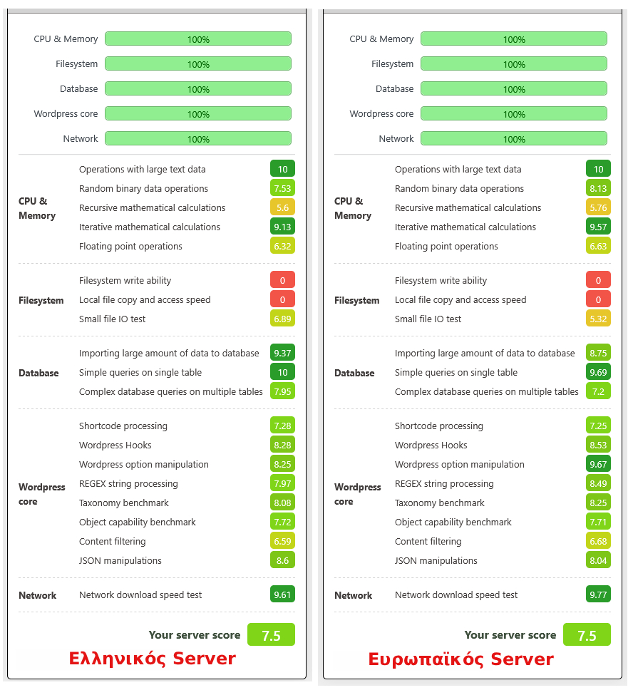 Και οι δύο servers δίνουν 0 σε “Filesystem write ability” & “Local file copy”.